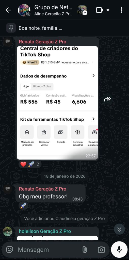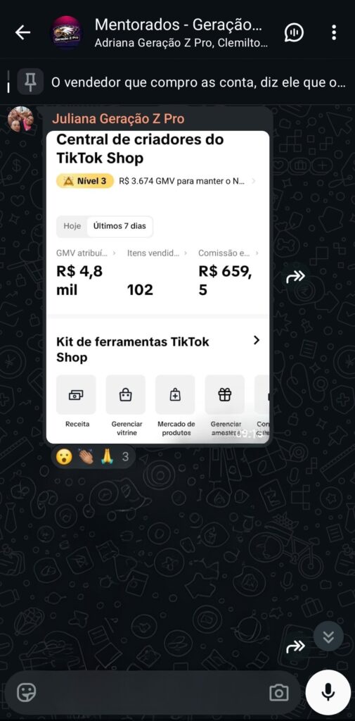 Após garantir sua vaga, o botão para entrar no grupo VIP aparece automaticamente na área de membros Kiwify. Lá você recebe atualizações, bônus e dicas exclusivas de quem está no topo do TikTok Shop.